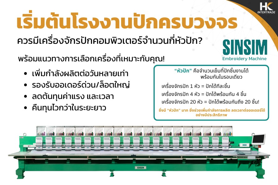เริ่มต้นโรงงานปัก เลือกจำนวนหัวปักให้ตรงกับธุรกิจ หากคุณสนใจที่จะลงทุนเครื่องจักรปักคอมพิวเตอร์ ขอแนะนำเครื่องจักรปักคอมพิวเตอร์ซินซิม (SINSIM) และแนะนำให้ศึกษาข้อมูลเพิ่มเติมเกี่ยวกับรุ่นต่าง ๆ ของเครื่องจักร และปรึกษาผู้เชี่ยวชาญจากบริษัท ฯ ของเรา เพื่อเลือกเครื่องจักรปักที่เหมาะสมกับความต้องการของคุณ